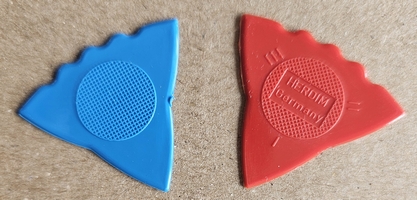 Herdim H-1 These picks are very popular with dulcimer players. They have three picking edges with each edge having a different thickness. The center section is textured for better grip. Price: $1 ea. ![]() |